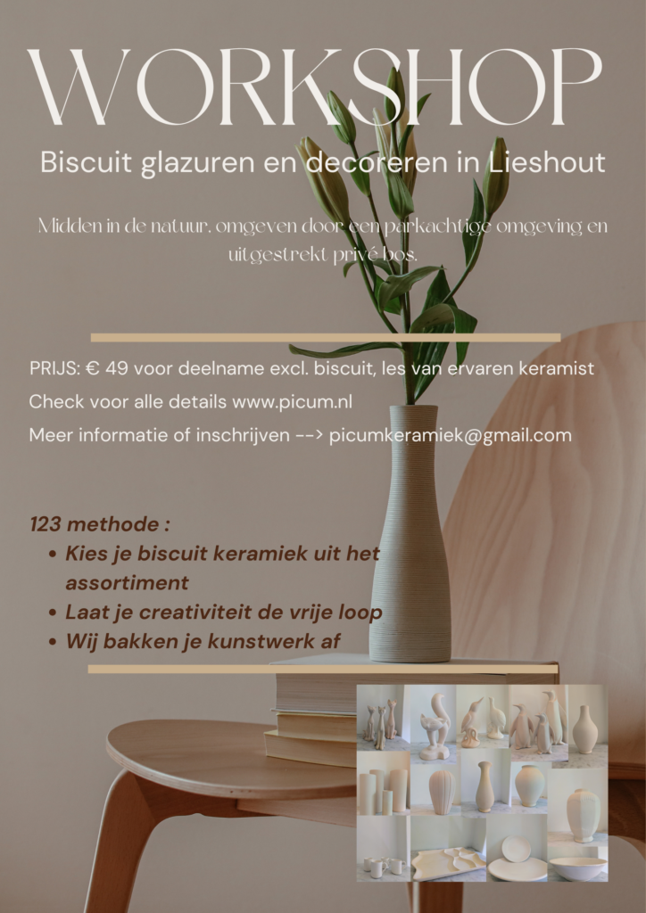 • Schrijf je in door je aan te melden via picumkeramiek@gmail.com, deelname is €49 per deelnemer. Daarvoor krijg je koffie, thee en wat lekkers, uitleg en begeleiding, gebruik van alle engobes, glazuren, onderglazuren, keramische transfers en liners: kortom alles wat je nodig hebt om jouw eigen kunstwerk kleur en karakter te geven.